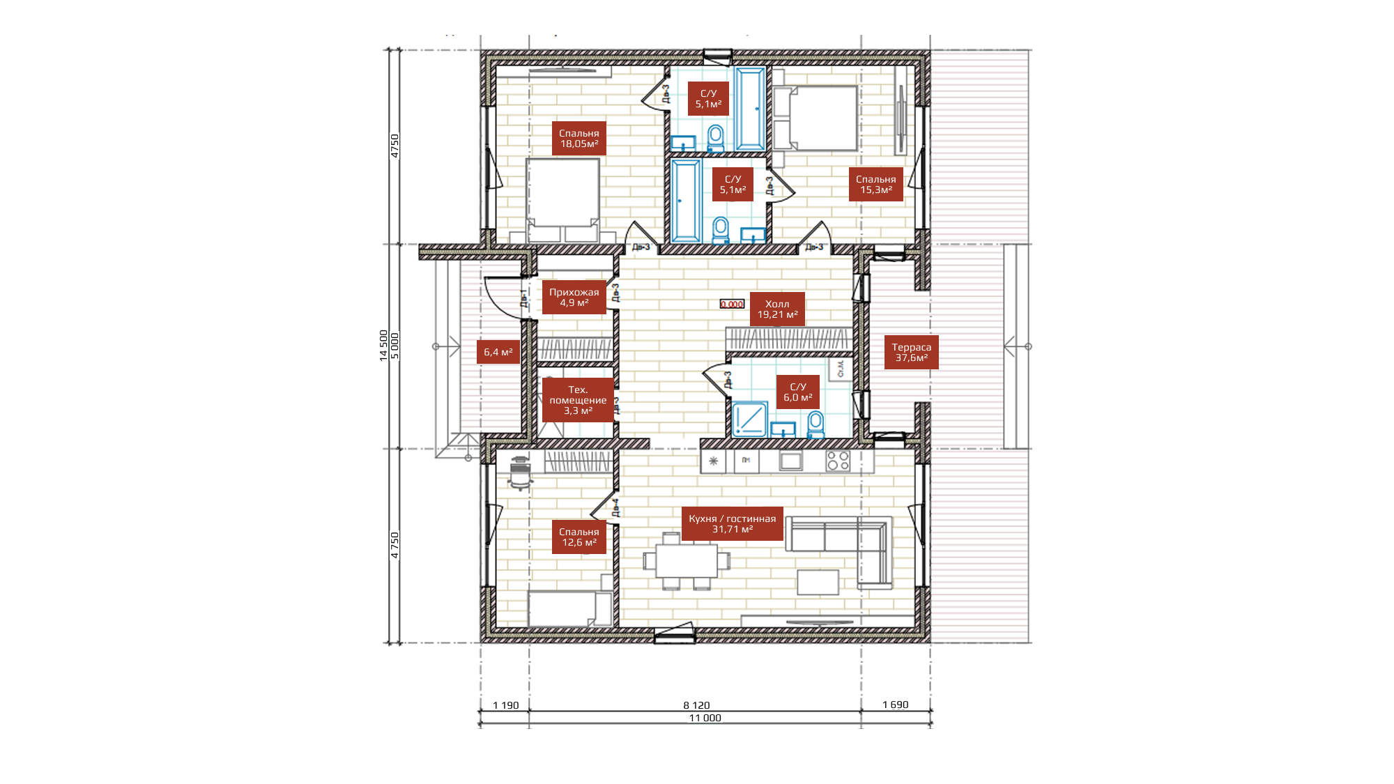 Общая площадь: 115.0 м2